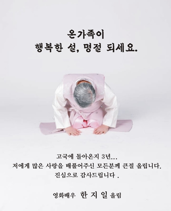 공개된 사진에는 '고국에 돌아온지 3년. 저에게 많은 사랑을 베풀어주신 모든 분께 큰절 올립니다. 진심으로 감사드립니다. 영화배우 한지일 올림.'이라는 문구가 담겼다.