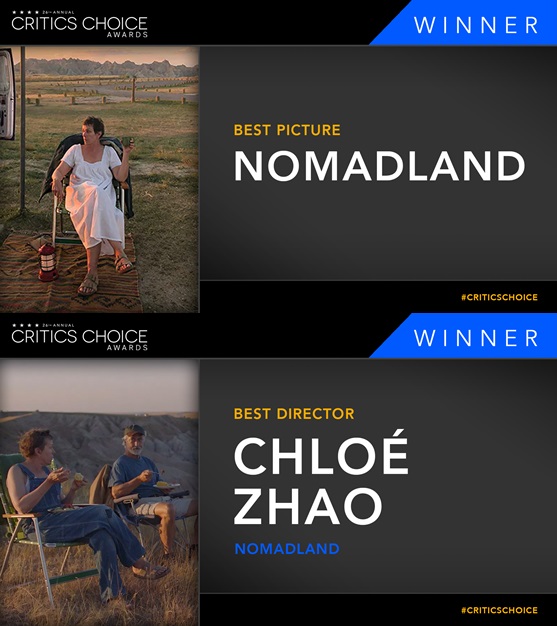 전 세계 유수 영화제 및 시상식을 휩쓸며 극찬 받고 있는 영화 '노매드랜드'가 제26회 크리틱스 초이스 시상식에서 작품상을 포함해 4관왕에 오르며 최다 수상의 영예를 안았다.