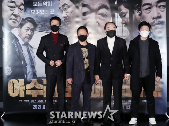 연예영화'아수라도' 감옥 접수를 위한 치열한 혈투[★포토]발행 : 2021.03.11 ・ 16:31김창현 기자배우 정미남, 이설구, 장광, 황인무가 11일 오후 서울 광진구 롯데시네마 건대입구점에서 진행된 영화 '아수라도' 언론시사회 및 기자간담회에 참석해 포즈를 취하고 있다.'아수라도'는 법과 원칙도 통하지 않는 악명 높은 제3교도소에서 제각기 다른 욕망을 가진 악인들이 펼치는 전쟁을 그린 범죄 액션 영화다. 오는 18일 개봉. / 2021.03.11<저작권자 © 스타뉴스, 무단전재 및 재배포 금지>아수라도추천 기사김창현 기자기자홈좋아요 연예-영화의 인기 급상승 뉴스연예-영화의 최신 뉴스