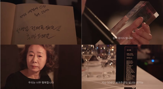 감사패에는 "언제나 우리들 가슴 속에서 빛날 윤여정님께. 꽃보다 더 귀한 윤여정 배우님과 함께 할 수 있어 우리는 행복합니다. 지난 50년간 보여주셨던 빛나는 연기는 오늘 밤 여기 계신 모든 분들 마음속에 깊이 새겨질 것입니다. 그동안 많이 애쓰셔습니다. 윤여정이라는 배우와 동시대를 살고 있음에 무척 행복합니다. 깊이 감사드립니다. 사랑합니다"라고 적혀 있다.