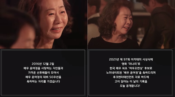 소속사 후크엔터테인먼트는 16일 오후 이를 기념하며 공식 유튜브 채널 후크TUBE에 '배우 윤여정 데뷔 50주년 기념 파티 Actress Yuh-Jung Youn's 50th Anniversary Party_2016.12.02'이라는 제목의 영상을 게시했다.