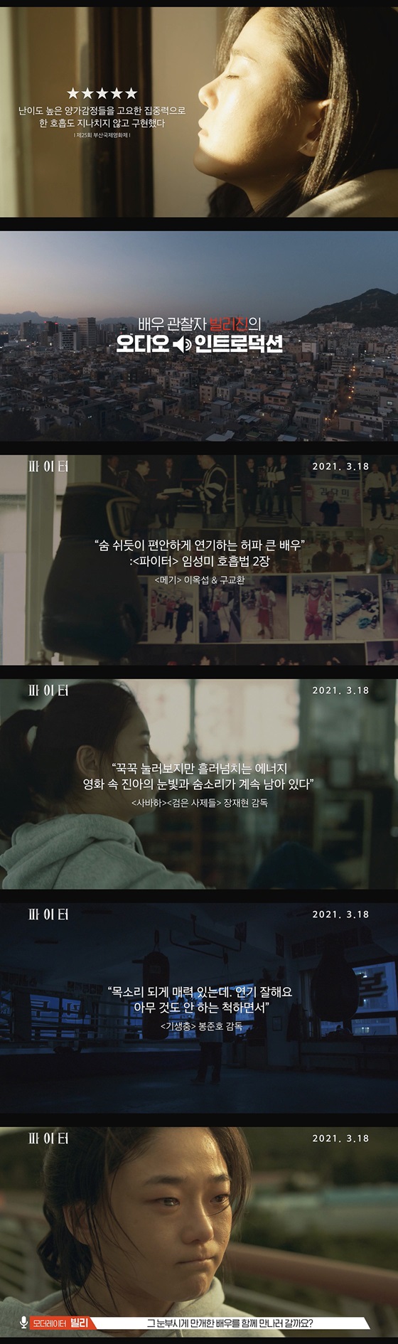 개봉 2주차를 맞으며, 공개한 '파이터'의 스페셜 리뷰영상-임성미 배우편은 배우 관찰자를 자처하는 빌리진(무브먼트 진명현 대표)의 오디오 인트로덕션이라는 신선한 형식으로, 배우를 초점에 두고 리뷰하는 본격 배우 리뷰영상이다.