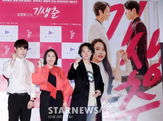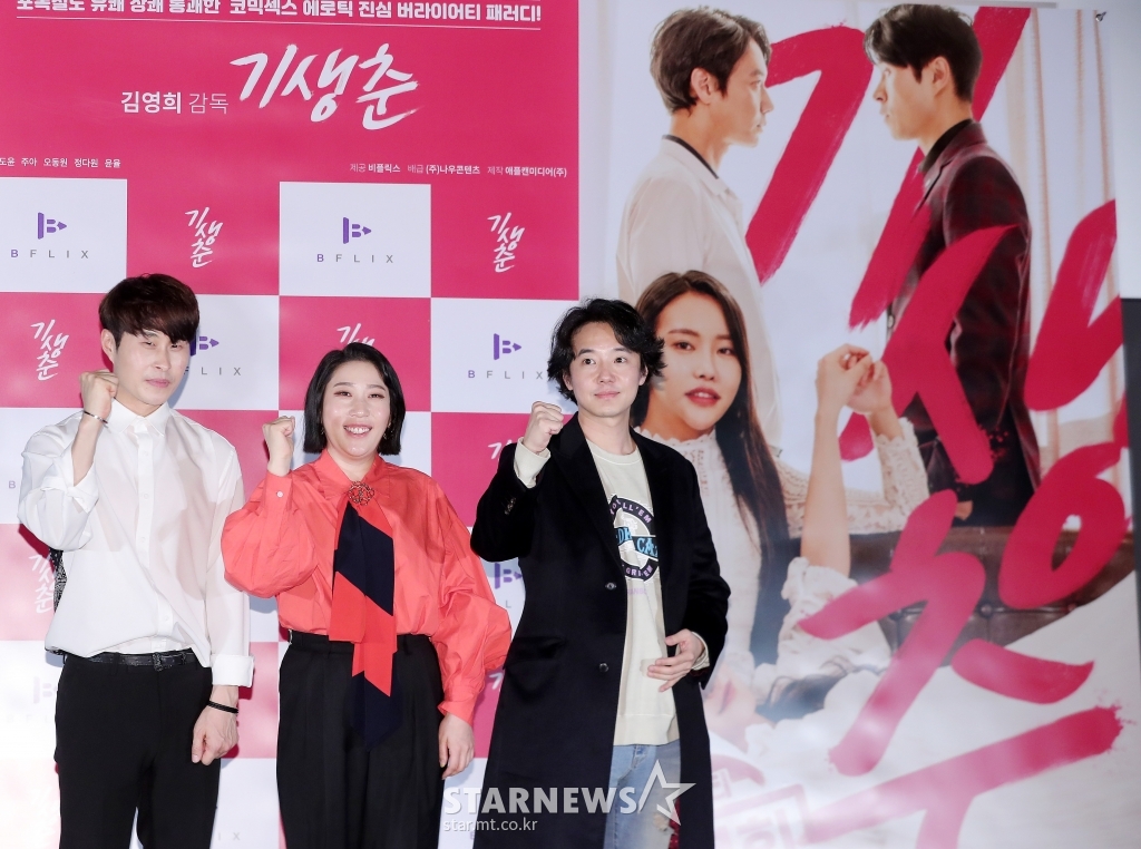 김영희 감독(가운데), 배우 민도윤, 오동원이 24일 오후 서울 광진구 롯데시네마 건대입구점에서 열린 성인영화 '기생춘' 언론시사회 및 간담회에 참석해 포즈를 취하고 있다.봉준호 감독의 '기생충'을 패러디한 섹시 코미디 성인영화 '기생춘'은 미래에 대한 고민을 떨칠 수 없던 여주인공 '춘'이 우연한 기회에 대저택에 숨어 들어가면서 펼쳐지는 이야기를 담았다. 4월 중 IPTV 등을 통해 공개. 2021.03.24