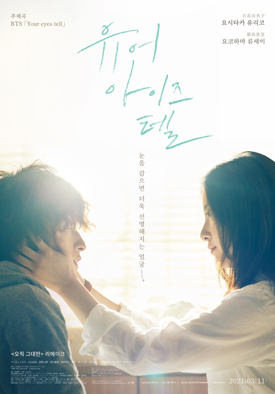 소지섭, 한효주 주연의 감성 멜로 '오직 그대만' 리메이크작 '유어 아이즈 텔'은 제25회 부산국제영화제에서의 뜨거운 열기를 국내 극장가에 그대로 이어갔다. '양지의 그녀', '나는 내일, 어제의 너와 만난다'의 감성 장인 미키 타카히로 감독의 섬세한 연출력과 아름다운 영상미 그리고 전 세계를 사로잡은 국내 최고의 아티스트 방탄소년단 첫 영화 OST 참여로 화제를 모았다.