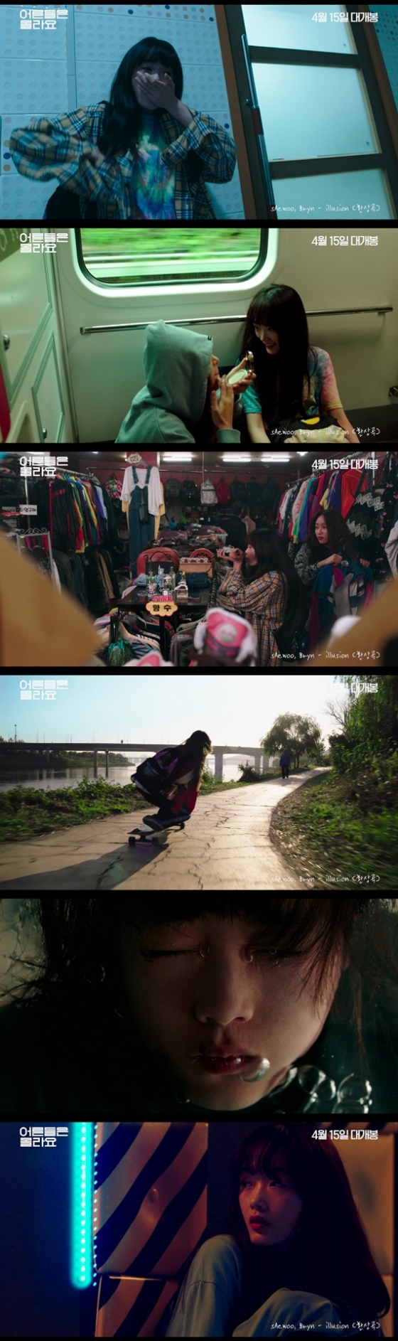 이번에 공개된 뮤직비디오 영상은 '어른들은 몰라요'의 매력적인 사운드트랙 sAewoo, Bryn의 illusion (환상곡)이 흐르는 가운데, 18세 ‘세진’과 동갑내기 ‘주영’의 다사다난한 여정을 흥미롭게 담아내어 이목을 집중시킨다. 숨 막히는 현실을 잊고자 두 눈을 꼭 감고 물에 얼굴을 담근 ‘세진’이 가녀린 숨을 내뱉는 장면으로 시작한 영상은 자유롭게 롱보드를 타는 이를 바라보는 지친 눈빛의 외로운 ‘세진’의 모습으로 이어져 눈길을 끈다. 다음으로, “한 번만 밀어줘”라고 애원하던 ‘세진’이 계단에서 나뒹구는가 하면, 성분을 알 수 없는 약을 입에 털어 넣고 고통스러워하는 장면이 이어져 이들의 여정에 과연 무슨 일이 일어난 것인지 궁금증을 자극한다. 한편, ‘세진’이 우연히 동갑내기 ‘주영’을 만나 영락없는 10대 소녀처럼 해맑은 표정으로 즐겁게 장난치는 모습은 흐뭇한 미소를 자아낸다. 끝으로, 영상은 ‘세진’이 모든 고민을 잊고 따스한 햇살 아래 자유롭게 롱보드를 타는 장면으로 마무리되어 ‘세진’의 자유로운 질주가 계속될 수 있을지 기대감을 갖고 보게 만든다.