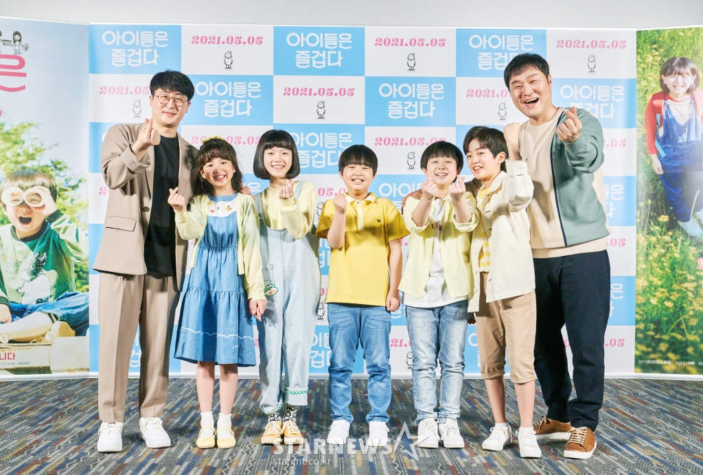 이지원 감독, 아역배우 박시완, 박예찬, 이경훈, 홍정민, 옥예린, 배우 윤경호가 21일 오후 서울 강남구 삼성동 메가박스 코엑스점에서 진행된 영화 '아이들은 즐겁다' 언론시사회 및 기자간담회에 참석해 포즈를 취하고 있다.