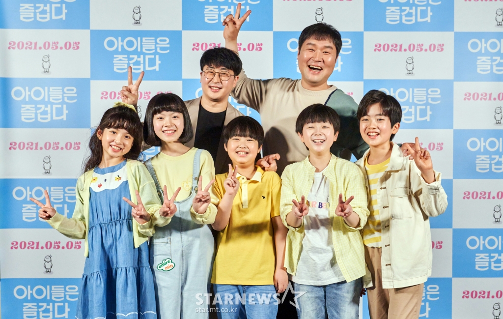 이지원 감독, 배우 윤경호, 아역배우 옥예린, 홍정민, 박예찬, 이경훈, 박시완이 21일 오후 서울 강남구 삼성동 메가박스 코엑스점에서 진행된 영화 '아이들은 즐겁다' 언론시사회 및 기자간담회에 참석해 포즈를 취하고 있다.