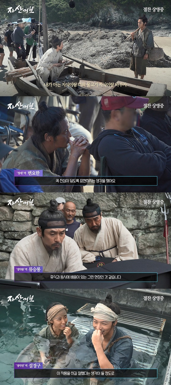 함께 공개된 현장 스틸에서는 배우들이 작품에 임하는 진심 어린 마음과 태도는 물론 훈훈한 촬영 현장의 분위기를 고스란히 느낄 수 있다. 유배지로 향하는 정약전의 걸음, 배를 타고 있는 어부 창대의 모습 등 연기에 진지하게 임하고 있는 설경구와 변요한의 모습뿐만 아니라 프로페셔널한 모습으로 촬영본을 모니터링하는 설경구, 이정은, 차순배의 모습까지 담고 있어 완벽한 연기를 선보이기 위한 배우들의 노력을 엿볼 수 있다.