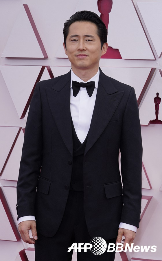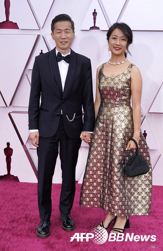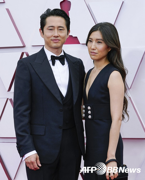 먼저 '미나리'를 연출한 정이삭 감독은 턱시도를 입고 아내와 함께 레드카펫을 걸었다. 스티븐 연 역시 아내와 함깨 했으며, 깔끔한 턱시도를 입고 미소를 지었다.