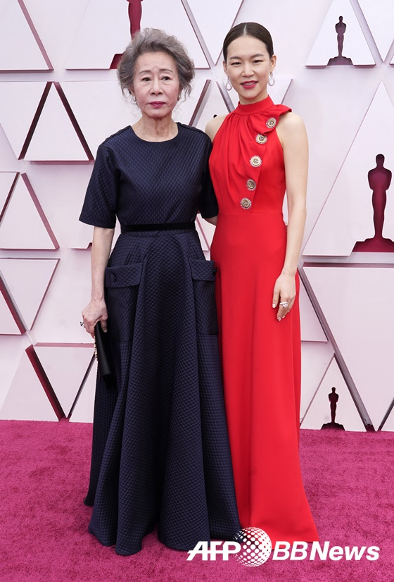 윤여정은 심플한 블랙 드레스를 입고 여유로운 모습을 자랑했다. 심플하지만 윤여정만의 포스를 뽐냈다. 한예리는 강렬한 레드 드레스를 선택했다. 윤여정과 한예리는 '미나리'의 모녀 케미스트리를 자랑해 시선을 끌었다.