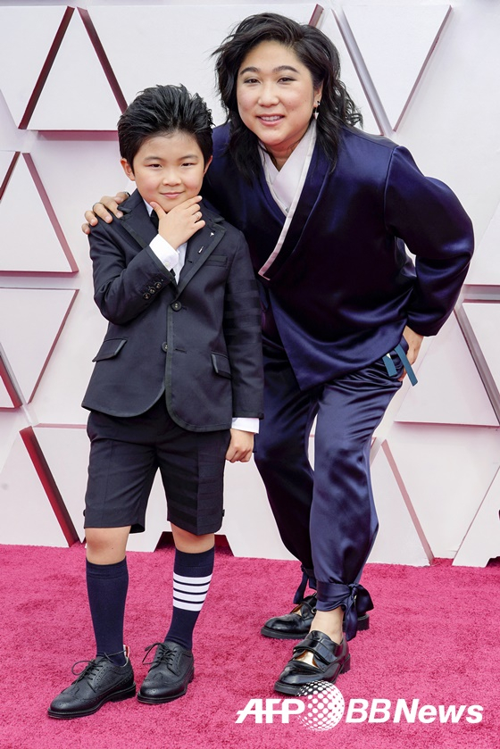앨런 김은 '미나리'의 프로듀서인 크리스티나 오와 함께 했다. 극중에서도 신스틸러 역할을 톡톡히 한 만큼, 레드카펫에서도 남다른 존재감을 뽐냈다.