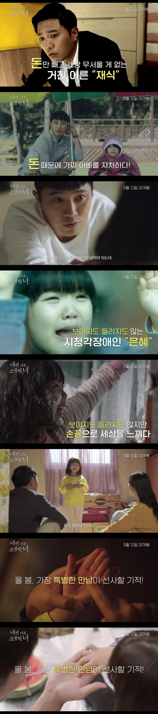 돈만 빼고 세상 무서울 거 없던 재식과 듣지도 보지도 못하지만 손끝으로 세상을 느끼는 아이 은혜의 특별한 만남을 다룬 기적 같은 이야기를 선보일 '내겐 너무 소중한 너'는 5월 12일 극장에서 개봉한다.