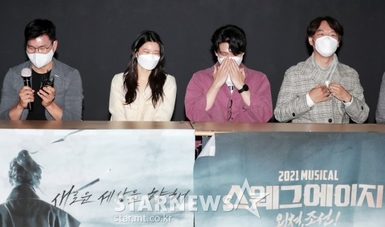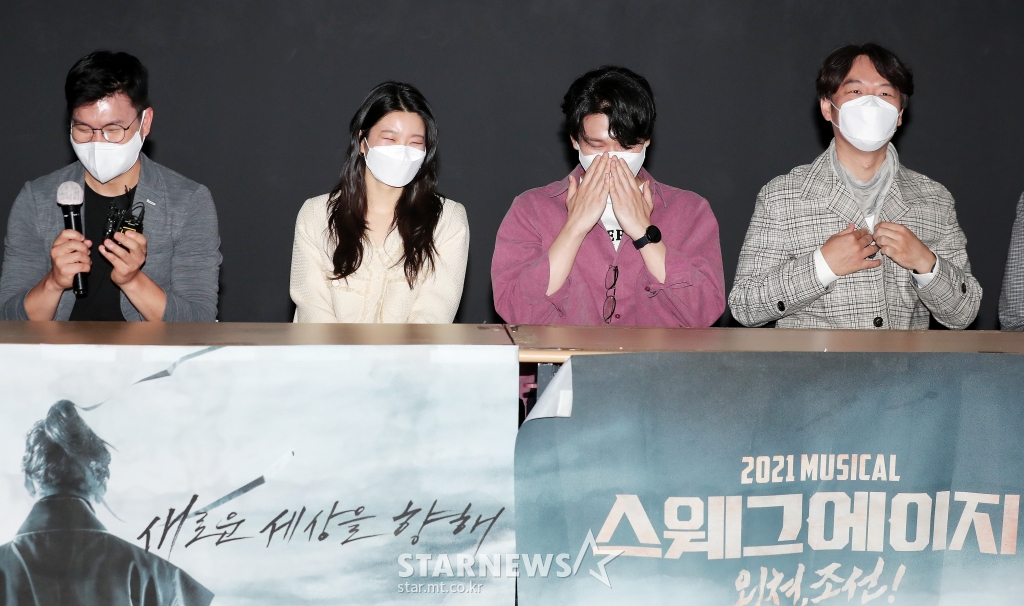 뮤지컬 배우 이경수, 김수하, 양희준, 임현수가 10일 오후 서울 광진구 롯데시네마 건대입구점에서 진행된 뮤지컬 '스웨그 에이지: 외쳐, 조선!' 언론시사회에 및 간담회에서 미소를 짓고 있다.
