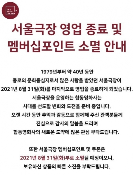3일 서울극장 측은 SNS 등을 통해 "서울극장 영업 종료 및 멤버십포인트 소멸 안내' 고지를 했다. 서울극장 측은 "1979년부터 약 40년 동안 종로의 문화중심지로서 많은 사랑을 받았던 서울극장이 2021년 8월31일을 마지막으로 영업을 종료하게 되었습니다"라고 알렸다.