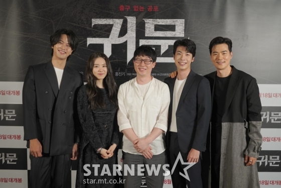 심덕근 감독(가운데), 배우 이정형, 김소혜, 홍진기, 김강우가 3일 오후 온라인으로 진행된 영화 '귀문' 시사회 및 간담회에 참석해 포즈를 취하고 있다.