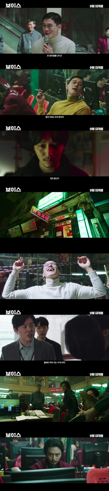 이어 "돈 냄새들 나지, 돈 냄새 풀풀 난다고"라는 대사와 함께 보이스피싱 본거지의 총책 곽프로가 개성 강한 모습을 드러낸다. 지금까지 이미지와는 전혀 다른 변요한과 김무열의 변신은 개성 강한 리얼범죄액션 '보이스'의 재미를 예고한다. 이어 지능범죄수사대 팀장 이규호 역의 김희원, 콜센터의 절대적 감시자 천본부장 역의 박명훈까지 짧은 예고편을 가득 채운 이들의 존재감이 영화의 풍성함을 더한다. 영상의 말미 서준이 담담하게 "죽일 거야"라고 읊조리는 장면은 그가 거대 보이스피싱 조직을 상대로 펼칠 리얼하고도 통쾌한 액션에 대한 기대감을 높인다.