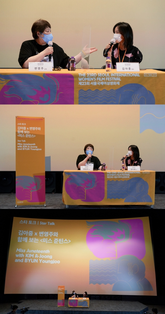 지난달 28일 '김아중X변영주와 함께 보는 '미스 준틴스 스타 토크'에 참석한 김아중은 변영주 감독과 함께 영화 '미스 준틴스'에 대한 관람평을 나누며 관객과 소통했다. 김아중은 영화의 시대적 상황과 다양한 관점에 대해 설명하는 변영주 감독의 이야기를 경청하는가 하면, 자신의 관람 소감과 의견을 나누며 영화에 공감하는 모습으로 '돌보다, 돌아보다'를 슬로건으로 내건 공감성 영화제의 의미를 더했다.