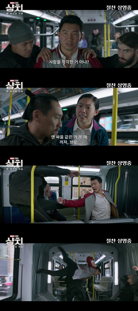 공개된 영상에는 자신의 과거를 뒤로한 채 평범한 삶을 살아가던 샹치(시무 리우 분)가 아버지 웬우(양조위 분)가 이끄는 미스터리 조직 텐 링즈 무리의 습격을 당하면서 암살자로 훈련된 자신의 본 모습을 세상에 드러내는 모습이다. 도심 한복판을 질주하는 버스 안에서 무기 하나 없이 맨몸으로 적들을 상대하는 샹치의 폭발적인 액션은 단 1초도 눈을 뗄 수 없을 만큼 강렬한 몰입감을 선사한다.