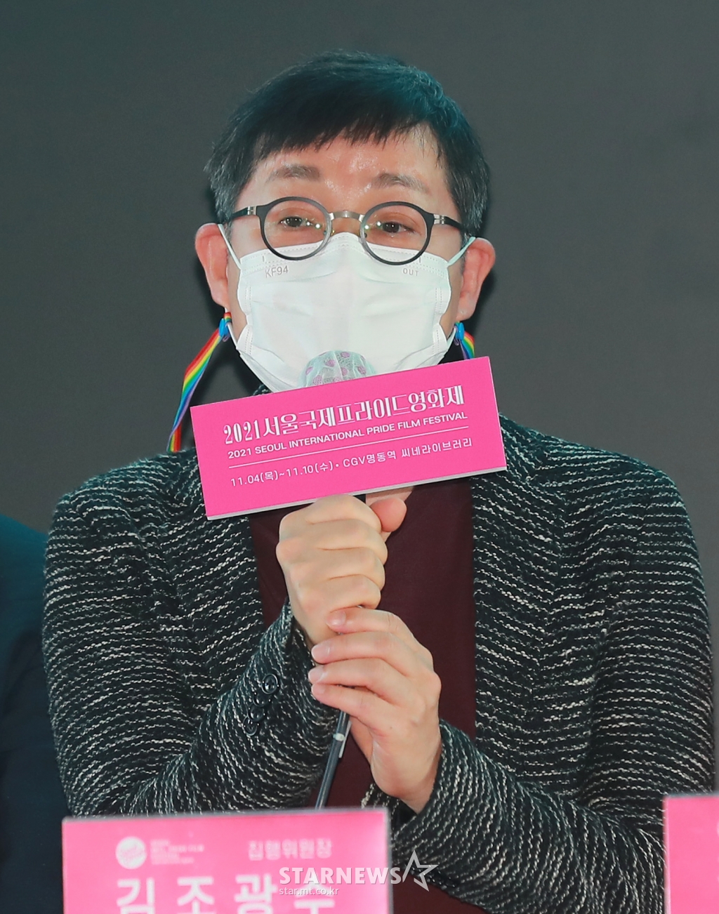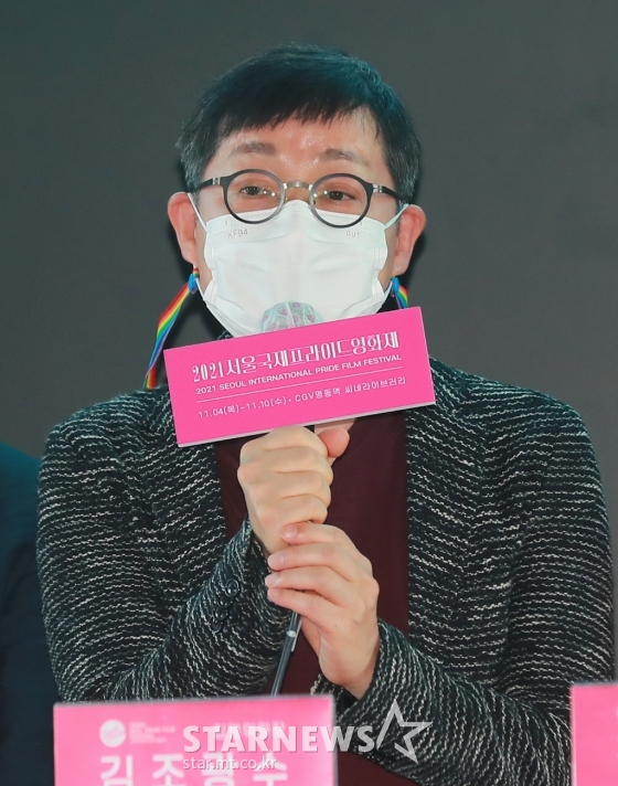 김조광수 집행위원장이 13일 오전 서울 동작구 아트아인 야외테라스에서 진행된 2021 서울국제프라이드영화제(SIPFF) 기자간담회에 참석해 인사말을 하고 있다.