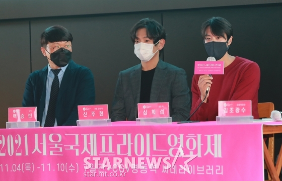 13일 오전 서울 동작구 아트아인 야외테라스에서 진행된 2021 서울국제프라이드영화제(SIPFF) 기자간담회에서 개막작으로 선정된 영화 '안녕, 내일 또 만나'의 백승빈 감독, 배우 신주협, 심희섭이 질문에 답하고 있다.