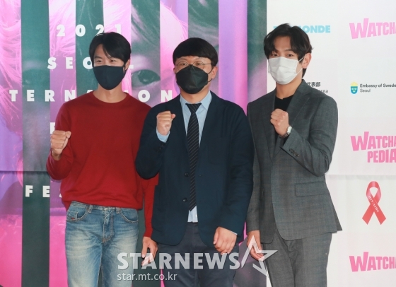 13일 오전 서울 동작구 아트아인 야외테라스에서 진행된 2021 서울국제프라이드영화제(SIPFF) 기자간담회에서 개막작으로 선정된 영화 '안녕, 내일 또 만나'의 배우 심희섭, 백승빈 감독, 배우 신주협이 포즈를 취하고 있다.