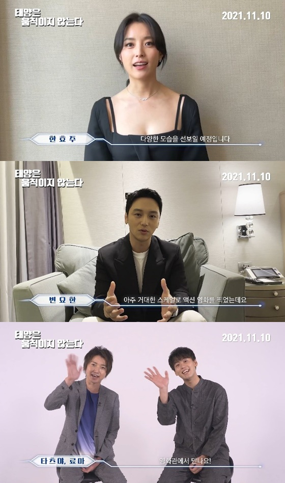 최근 (주)미디어캐슬 측은 영화 '태양은 움직이지 않는다'의 주역 후지와라 타츠야, 타케우치 료마, 한효주, 변요한이 깜짝 개봉 인사 영상을 공개했다. '태양은 움직이지 않는다'는 24시간마다 다가오는 죽음의 위험을 안고, 전 세계에서 극비 정보들을 조사하는 AN통신 요원들의 이야기를 담은 논스톱 스파이 액션이다.