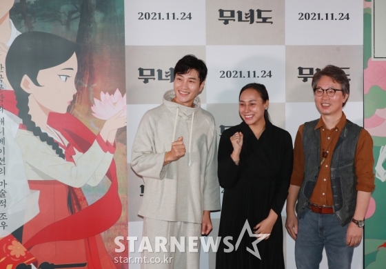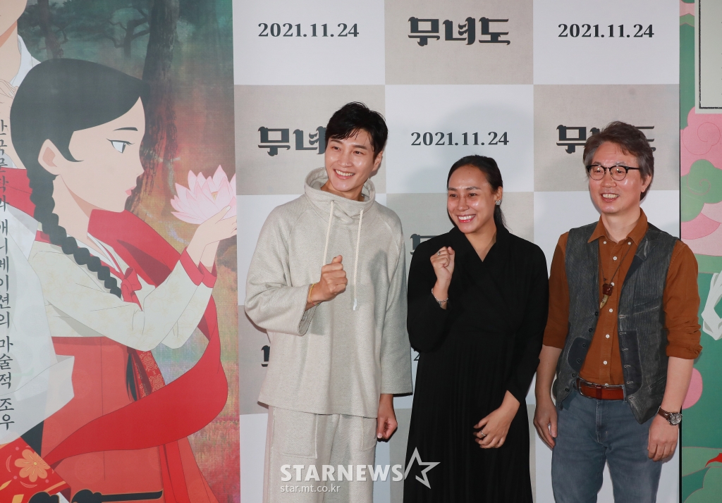 뮤지컬 배우 김다현, 소냐, 안재훈 감독이 15일 오후 서울 코엑스 메가박스에서 진행된 애니메이션 '무녀도' 언론시사회에 참석해 포즈를 취하고 있다.