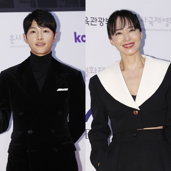 (서울=뉴스1) 권현진 기자 = 배우 송중기(왼쪽)와 전도연이 19일 오후 서울 강남구 CGV 청담씨네시티에서 열린 ‘제26회 춘사국제영화제’ 레드카펫 행사에 참석해 포즈를 취하고 있다. 2021.11.19./뉴스1