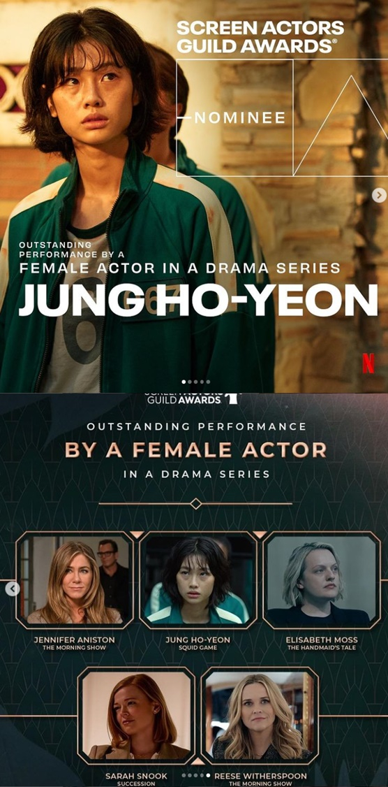 12일 오후(현지시각) 미국 배우조합(SAG)은 올해 시상식 후보를 발표했다. SAG에 따르면 제 '오징어 게임'은 28회 배우조합 시상식에서 앙상블상, 스턴트 앙상블상, 남우주연상, 여우주연상 4개 부문 후보로 올랐다. 이정재와 정호연은 각각 남녀 주연상 후보에 이름을 올렸다. 정호연은 '더 모닝쇼'의 제니퍼 애니스톤, 리즈 위더스푼, '핸드메이드 테일' 엘리자베스 모스, '석세션'의 사라 스눅과 여우주연상을 두고 경쟁하게 됐다.
