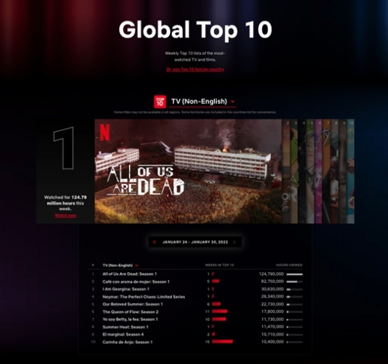 2일 넷플릭스 TOP 10 웹사이트에 따르면 '지금 우리 학교는'이 넷플릭스 글로벌 TOP 10 TV(비영어) 부문 정상을 차지했다. 이는 지난 일주일간의(1/24~30) 시청 시간을 집계한 것. '지금 우리 학교는'은 공개 후 단 3일 만에 1억 2479만 시청 시간을 기록하며 한국을 비롯한 아시아 국가와(홍콩, 인도, 인도네시아, 일본, 바레인, 방글라데시, 요르단, 쿠웨이트, 말레이시아, 오만, 파키스탄, 필리핀, 카타르, 사우디아라비아, 싱가포르, 대만, 태국, 아랍에미리트, 베트남), 유럽(프랑스, 독일), 아프리카(모리셔스, 나이지리아, 레위니옹), 아메리카(과들루프, 마르티니크, 자메이카), 오세아니아(뉴칼레도니아) 등 총 29여 개국에서 TOP 10 리스트 1위를 차지했다.