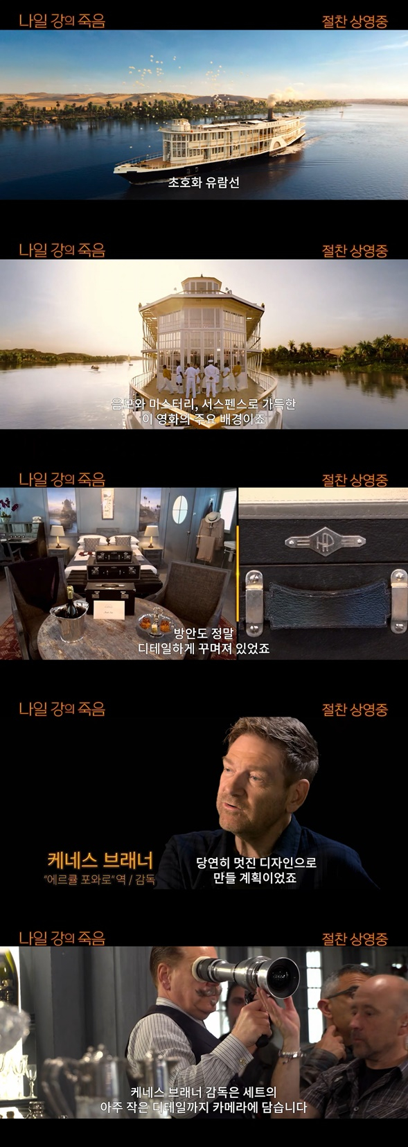 프로덕션 디자이너 '짐 클레이'는 "케네스 브래너 감독은 세트의 아주 작은 디테일까지 카메라에 담았다"고 전했다. 전 세계 단 4대뿐인 65mm 필름 카메라로 촬영하는 모습 역시 다채롭게 담겼다. '카르낙 호' 곳곳에 놓인 갖가지 소품과 볼거리, 이와 어우러지는 캐릭터들의 세밀한 부분까지 모두 담아낸 '케네스 브래너'의 남다른 열정을 확인할 수 있다. 이처럼 '나일 강의 죽음'에서만 볼 수 있는 황홀한 시각적 경험이 입을 떡 벌어지게 만든다.