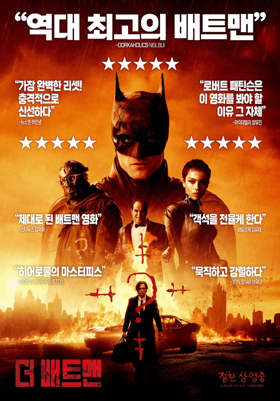 한편 '더 배트맨'은 2D, IMAX, 돌비 애트모스 & 돌비 비전(Dolby Atmos & Vision), ScreenX, 4DX, SUPER 4D 포맷으로 전국 극장에서 절찬 상영 중이다.