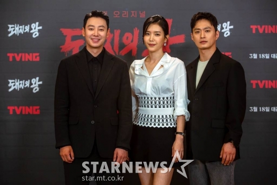 배우 김동욱, 채정안, 김성규가 15일 오후 온라인으로 진행된 티빙 오리지널 '돼지의 왕' 제작발표회.에 참석해 포즈를 취하고 있다. 2022.03.15. <사진=티빙> /사진=임성균 기자 tjdrbs23@
