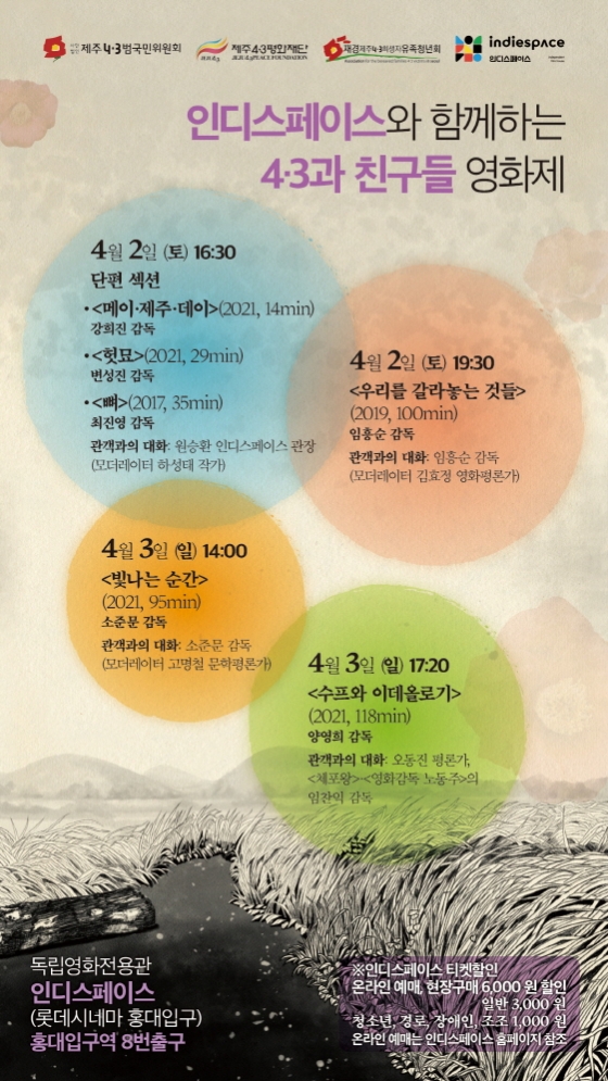 제주4.3범국민위원회가 제주4.3 제74주년을 맞아 '인디스페이스와 함께하는 4.3과 친구들 영화제'를 개최한다. 인디스페이스에서 열리는 '인디스페이스와 함께하는 4.3과 친구들 영화제'는 오는 2일과 3일 양일간 장·단편 6편을 상영하고 매회 관객과의 대화를 진행한다.