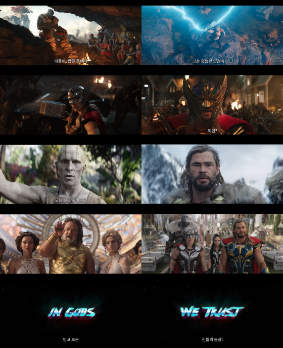 '코르그'의 유쾌한 매력이 담긴 목소리로 시작되는 메인 예고편은 슈퍼히어로 '토르'의 지난 여정을 임팩트 있게 보여주며 흥미를 더한다. 우주를 통틀어 독보적인 파워와 존엄을 자랑하는 천둥의 신 '토르'의 모습은 전 여친이자, 마이티 토르로 거듭난 '제인 포스터'의 등장으로 분위기가 반전되며, 호기심을 불러 일으킨다. 한편, 시선을 사로잡는 강렬한 비주얼로 등장한 빌런 '고르'가 신들을 향한 증오를 드러내며 신들의 몰살을 선언하고, 그에 대적하기 위한 역대급 스케일의 액션이 펼쳐질 것으로 기대를 모은다. 또한, "믿고 보는 신들의 등장"이라는 카피는 천둥의 신 '토르', 신 도살자 '고르', 올림푸스의 신 '제우스'까지 압도적인 파워를 가진 캐릭터들의 만남을 예고해, 올여름 극장을 압도할 단 하나의 마블 액션 블록버스터를 향한 뜨거운 관심이 집중되고 있다.