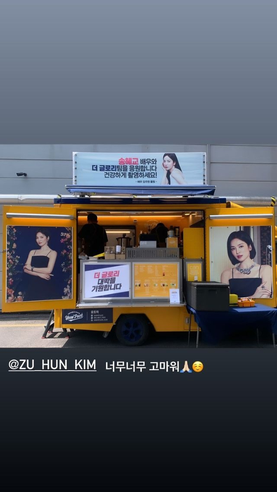 송혜교는 28일 인스타그램에 "너무너무 고마워"라며 배우 김주헌에게서 받은 커피차 사진을 공개했다.