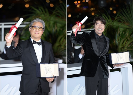 이날 박찬욱 감독과 송강호는 수상 직후 한국 기자들이 모여있는 프레스 룸을 찾았다. 함께 트로피를 들고 나타난 박찬욱 감독과 송강호는 쏟아지는 축하에 감사를 전했다.