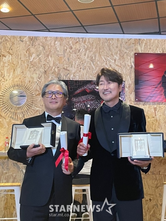 이날 박찬욱 감독과 송강호는 수상 직후 한국 기자들이 모여있는 프레스 룸을 찾았다. 함께 트로피를 들고 나타난 박찬욱 감독과 송강호는 쏟아지는 축하에 감사를 전했다.