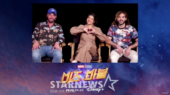 배우 이만 벨라니(가운데), 아딜 엘 아르비, 빌랄 팔라 감독가 3일 오전 화상으로 진행된 디즈니+ 오리지널 시리즈 '미즈 마블' 기자간담회에서 인사를 하고 있다.