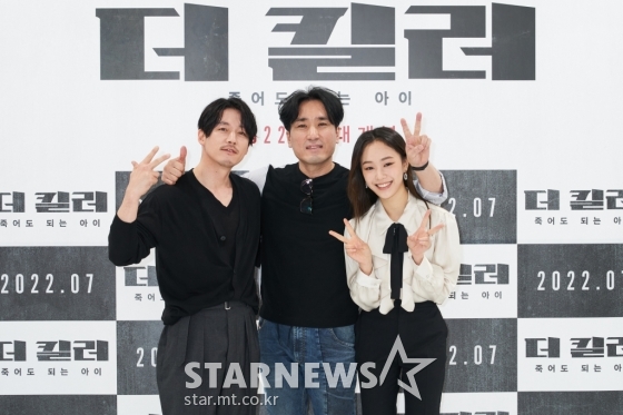 최재훈 감독(가운데), 배우 장혁, 걸그룹 공원소녀 이서영(앤)이 8일 오전 온라인으로 진행된 영화 '더 킬러:죽어도 되는 아이' 제작보고회에 참석해 포즈를 취하고 있다.