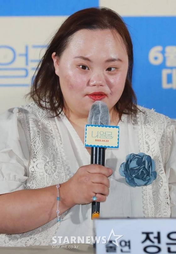 정은혜 작가가 14일 오후 서울 CGV용산아이파크몰에서 진행된 다큐멘터리 영화 '니 얼굴'(감독 서동일) 언론시사회에 참석해 질문에 답하고 있다. 발달장애인 은혜씨가 문호리리버마켓의 인기 셀러로 거듭나며 진정한 아티스트로 성장하는 과정을 담아낸 다큐멘터리 영화 '니얼굴’은 오는 23일 개봉된다. /2022.06.14 /사진=이동훈 기자 photoguy@
