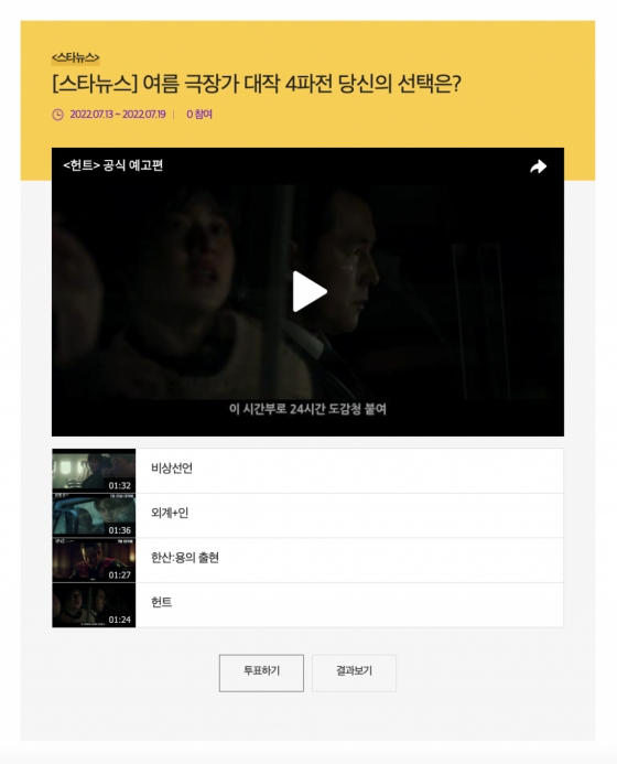 다음 연예 투표는 13일 오전 9시부터 19일 오후 11시 59분까지 '여름 극장가 대작 4파전 당신의 선택은?'이라는 질문으로 설문을 진행하고 있다.