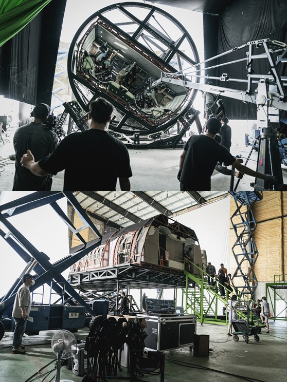 또 '비상선언'은 여기에 짐벌을 이용해 비행기의 움직임을 촬영하며 실제 비행기와 같은 느낌을 전한다. 재난 속 비행기 속에 갇힌 사람들을 생생하게 보여주기 위해 비행기 세트를 360도 회전시킬 짐벌을 촬영에 투입했다. 지름 7m, 길이 12m의 사이즈로 제작된 롤링 짐벌로 실제 크기의 항공기 세트를 회전시키며 촬영했다. 이처럼 영화를 촬영한 것은 한국 최초. 외국에서도 찾아보기 어려운 역대급 액션이다. '부산행'의 KTX 세트작업을 했던 이목원 미술감독이 참여해 이같은 프로덕션을 만들었다. 그 무엇보다 안전이 중요했던만큼, 작은 부품 하나까지 철저하게 확인하며 안전 테스트를 하고 세트를 만들어 촬영했다.
