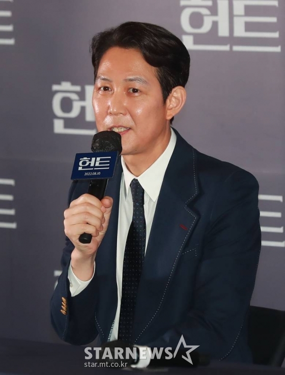 감독 겸 배우 이정재가 27일 오후 서울 강남구 메가박스 코엑스점에서 진행된 영화 '헌트'(감독 이정재) 언론시사회에 참석해 질문에 답하고 있다. 조직 내 숨어든 스파이를 색출하기 위해 서로를 의심하는 안기부 요원 박평호와 김정도의 이야기를 그린 영화 '헌트'는 8월 10일 개봉한다. /2022.07.27 /사진=이동훈 기자 photoguy@