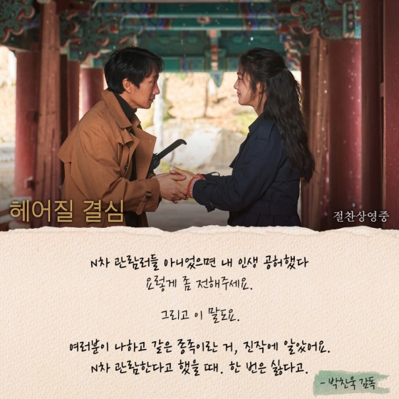 박찬욱 감독과 정서경 작가는 '헤어질 결심'의 각본을 공동 집필한 만큼, 영화의 명대사를 적극 활용한 진심 어린 감사 인사를 전해 관객들에게 더한 여운을 선사하고 있다. 먼저 박찬욱 감독은 "'N차 관람러들 아니었으면 내 인생 공허했다.', 요렇게 좀 전해주세요. 그리고 이 말도요. '여러분이 나하고 같은 종족이란 거, 진작에 알았어요. N차 관람한다고 했을 때. 한 번은 싫다고.'" 라며 극 중 박정민이 연기한 '홍산오'의 대사를 비롯 '서래'를 향한 '해준'의 절절한 마음이 담긴 대사를 응용한 재치 있는 메시지로 N차 관람 관객들에게 깊은 감사를 전했다.