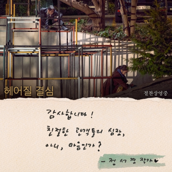 이어 정서경 작가 또한 "감사합니다! 친절한 관객들의 심장, 아니, 마음인가?"라며 '해준'을 사로잡았던 '서래'의 명대사를 응용해 영화의 여운을 곱씹게 하는 메시지로 관객들의 마음을 설레게 한다. 이처럼 박찬욱 감독과 정서경 작가의 뜻깊은 감사 메시지를 공개하며 '헤결앓이'를 중단하지 못하는 '헤결사'들에게 설렘을 선사한 '헤어질 결심'은 다채로운 해석부터 헤어 나올 수 없는 과몰입 열풍을 불러일으키며 장기 흥행에 청신호를 밝히고 있다.