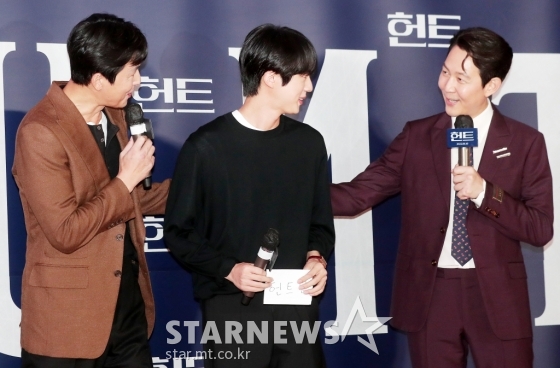 방탄소년단 진이 2일 오후 서울 강남구 삼성동 메가박스 코엑스에서 진행된 영화 '헌트' VIP시사회에 참석해 정우성, 이정재와 인사를 나누고 있다.