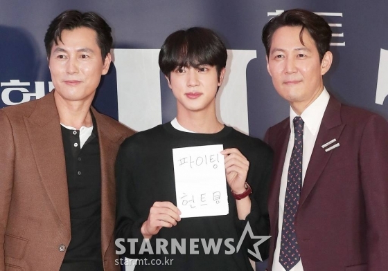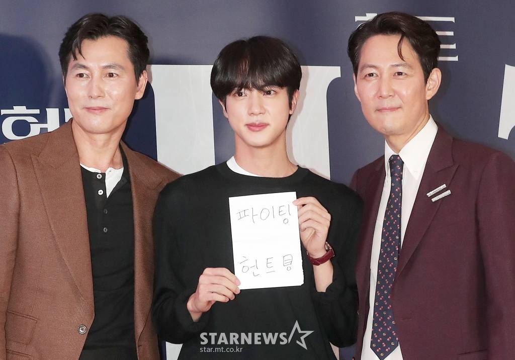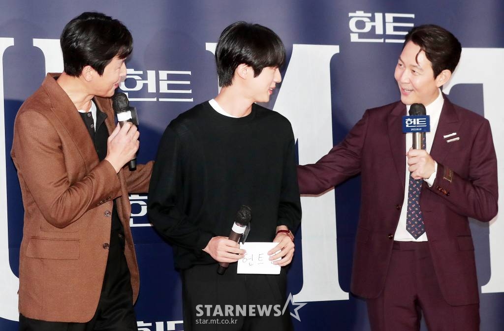 방탄소년단 진은 지난 2일 메가박스 코엑스에서 진행 된 영화 '헌트' VIP 시사회에 참석했다. 이날 진은 '헌트' 쇼케이스 무대에 올라 이정재 정우성과 인사를 나눴다.