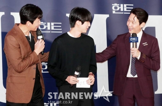 방탄소년단 진이 2일 오후 서울 강남구 삼성동 메가박스 코엑스에서 진행된 영화 '헌트' VIP시사회에 참석해 정우성, 이정재와 포즈를 취하고 있다. '헌트'는 조직 내 숨어든 스파이를 색출하기 위해 서로를 의심하는 안기부 요원 '박평호'와 '김정도'가 '대한민국 1호 암살 작전'이라는 거대한 사건과 직면하며 펼쳐지는 첩보 액션 드라마. 오는 10일 개봉. 2022.08.02 /사진=김창현 기자 chmt@