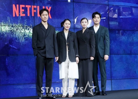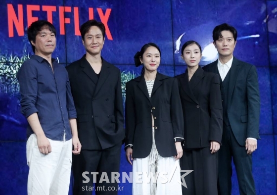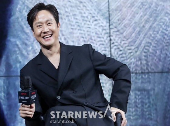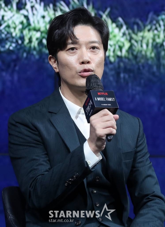 9일 넷플릭스(Netflix)의 '모범가족' 제작보고회가 서울 동대문 JW메리어트 호텔에서 진행 됐다. '모범가족'은 파산과 이혼 위기에 놓인 평범한 가장 동하가 우연히 죽은 자의 돈을 발견하고 범죄 조직과 처절하게 얽히며 벌어지는 범죄 스릴러다. 이날 제작보고회에는 정우, 박희순, 윤진섭, 박지연, 김진우 감독이 참석했다.